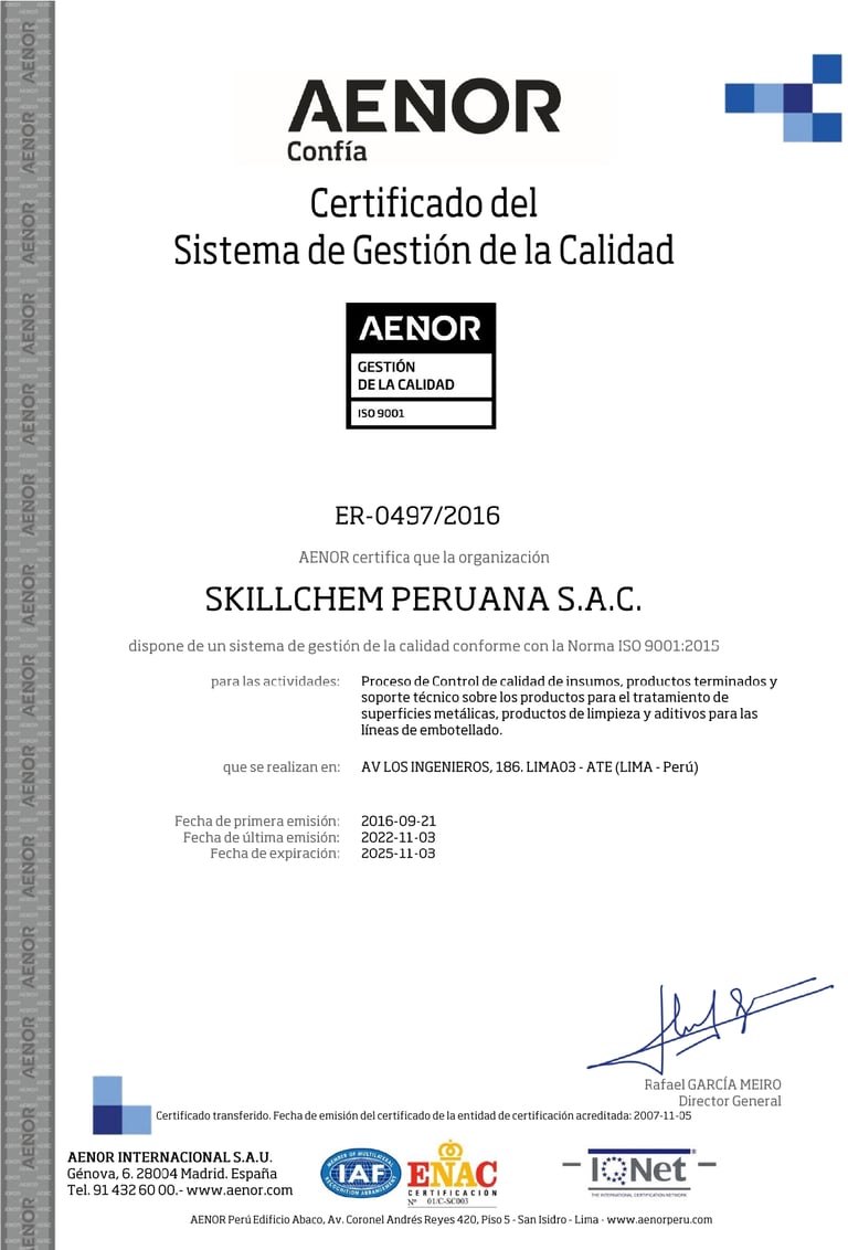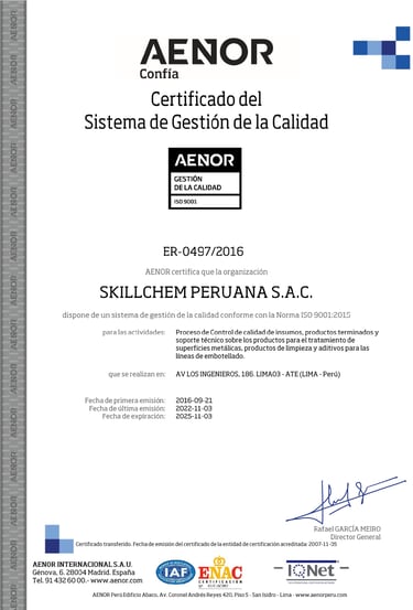 En Skillchem Peruana S.A.C., la calidad es un compromiso compartido que guía cada una de nuestras acciones, orientándonos a la satisfacción de nuestros clientes y al fortalecimiento de relaciones a largo plazo.